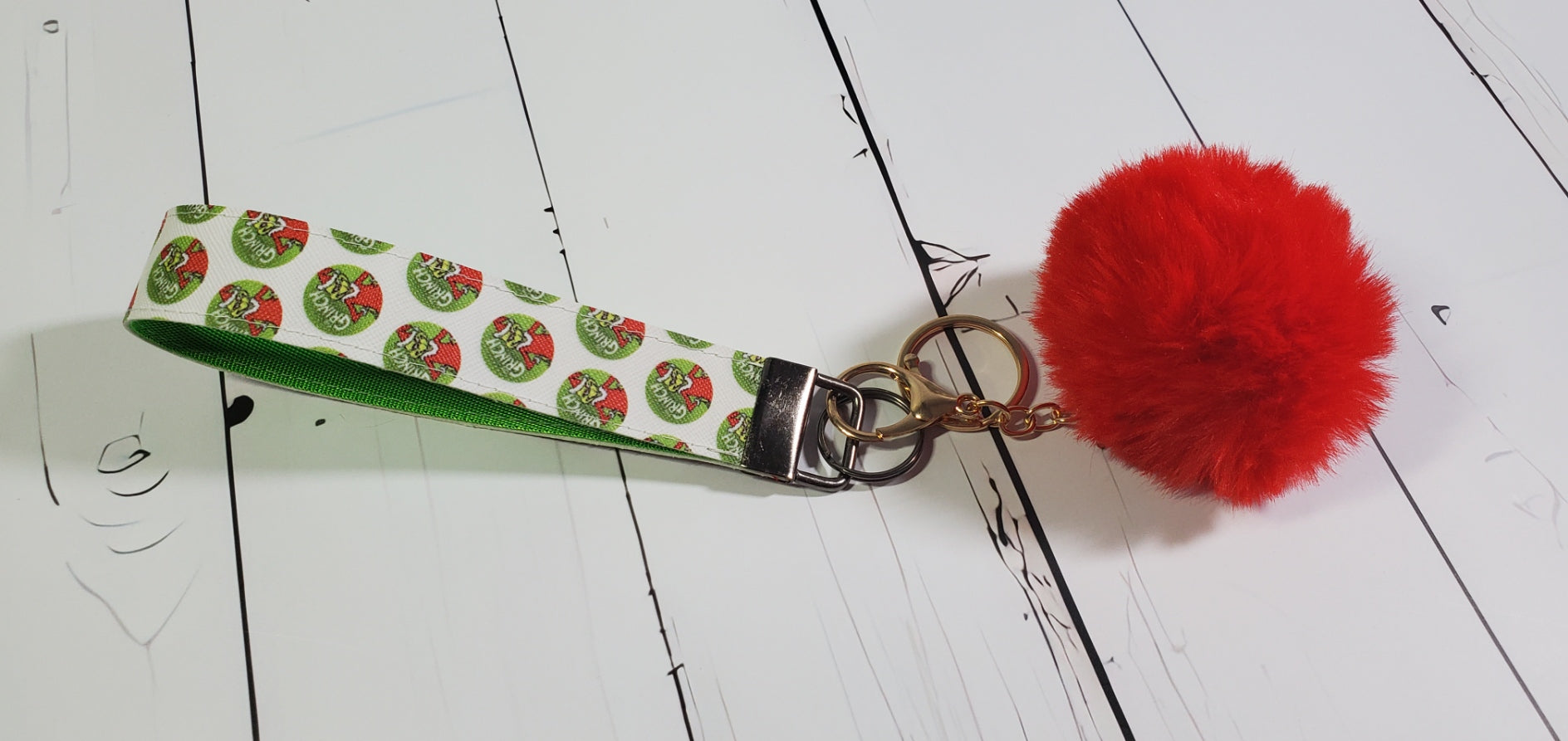 Green Grouch | Faux Leather & Nylon Fabric Keychain | Fluffy Pompom | Key Fob Wristlet | Christmas Print | Santa Hat Grinch