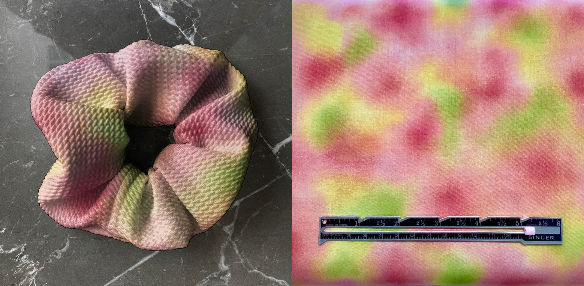 Examples can be seen in the next few photos. Please note that the 1st image is a mock up of what the scrunchie would look like. The mock up is a textured fabric BUT the actual print is a smooth cotton woven fabric. So it will look slightly different. The middle image in the collage is a photo I took of the fabric.