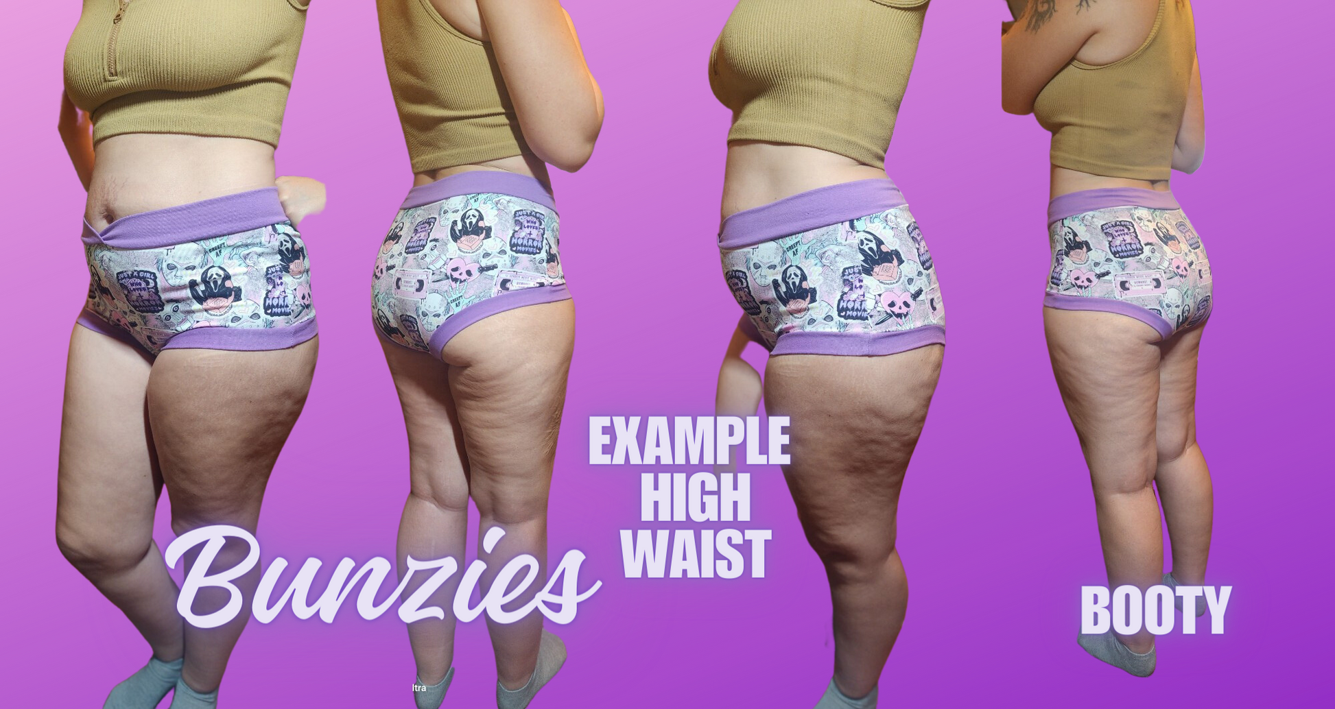 This pattern picks up where scrundlewear left off. There are 3 booty cuts included, Full Coverage, Booty and Super Booty. Also, choose between knit leg and waist bands or elastic, two rises, high and low, a maternity/cross front option