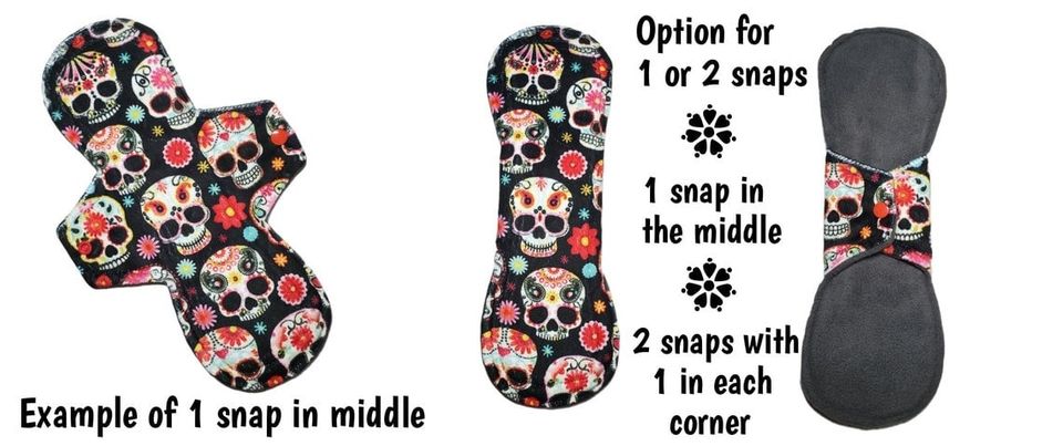 โฅ Simply place the patterned or pretty side of the pad facing up, towards your body. Because there is no sticky, irritating residue you secure the pad by snapping the wings around your panties.