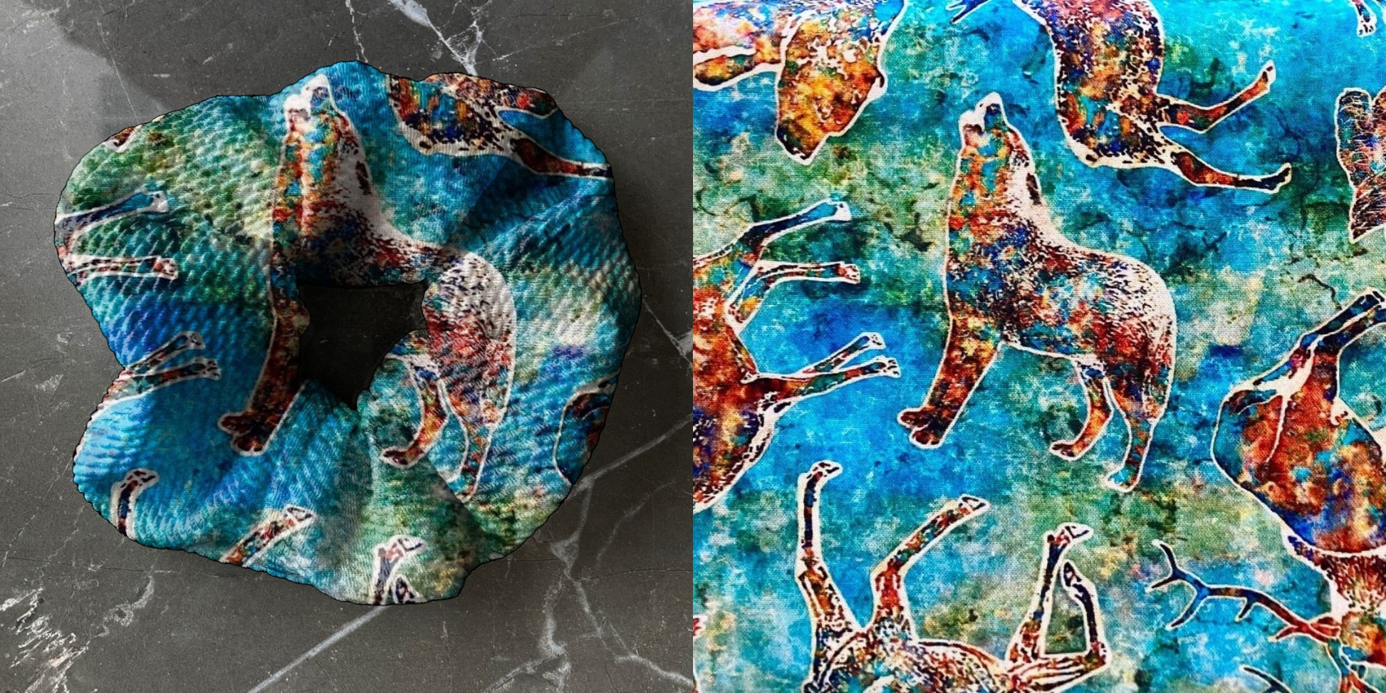 Examples can be seen in the next few photos. Please note that the 1st image is a mock up of what the scrunchie would look like. The mock up is a textured fabric BUT the actual print is a smooth cotton woven fabric. So it will look slightly different. The middle image in the collage is a photo I took of the fabric.
