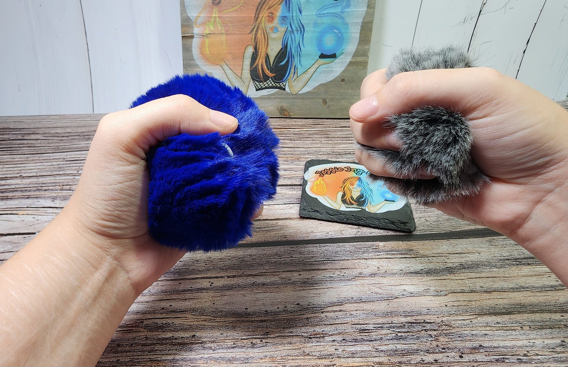 10 cm pompoms are in stock now! The blue is the new size 💙 shown in the next few images. These are so freaking soft and big! The whole pompom is nice and thick with 4x the amount of stuffing; not all fur like the smaller pompom shown. The smaller pompom can fit my hand when closed, unlike the blue one.