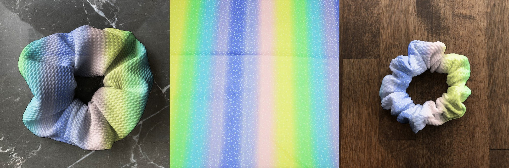 Examples can be seen in the next few photos. Please note that the 1st image is a mock up of what the scrunchie would look like. The mock up is a textured fabric BUT the actual print is a smooth cotton woven fabric. So it will look slightly different. The middle image in the collage is a photo I took of the fabric.
