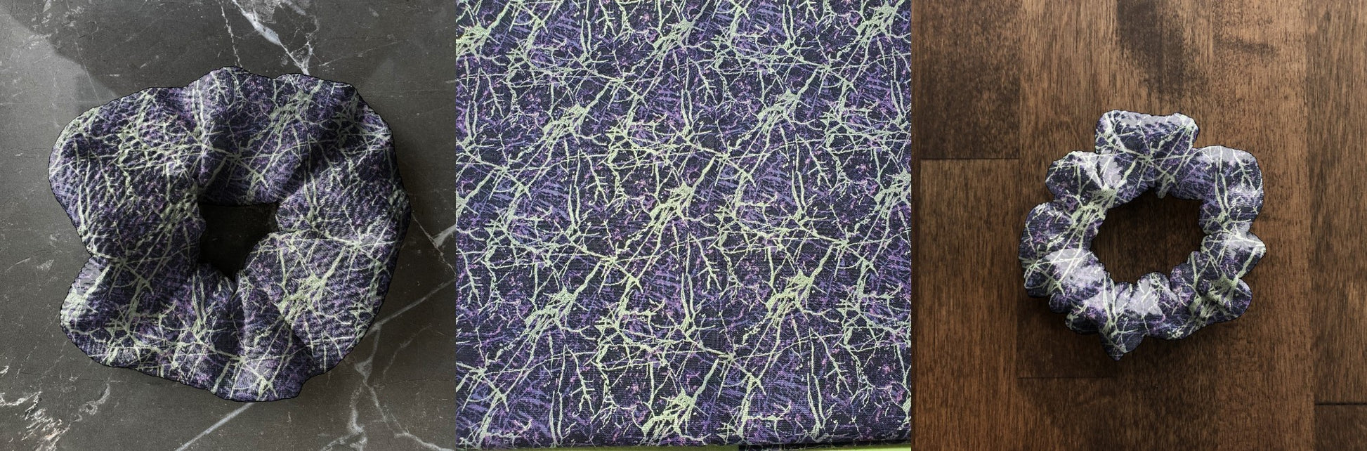 Examples can be seen in the next few photos. Please note that the 1st image is a mock up of what the scrunchie would look like. The mock up is a textured fabric BUT the actual print is a smooth cotton woven fabric. So it will look slightly different. The middle image in the collage is a photo I took of the fabric.