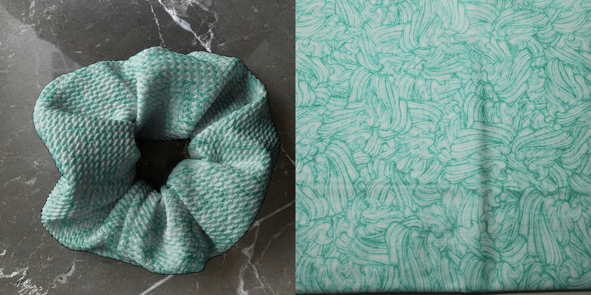 Examples can be seen in the next few photos. Please note that the 1st image is a mock up of what the scrunchie would look like. The mock up is a textured fabric BUT the actual print is a smooth cotton woven fabric. So it will look slightly different. The middle image in the collage is a photo I took of the fabric.