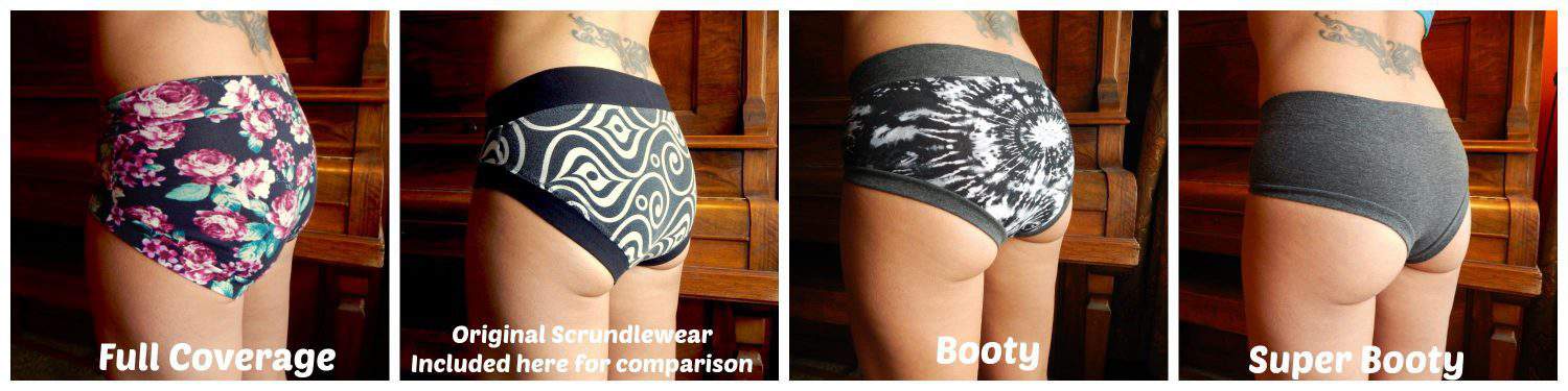 This pattern picks up where scrundlewear left off. There are 3 booty cuts included, Full Coverage, Booty and Super Booty. Also, choose between knit leg and waist bands or elastic, two rises, high and low, a maternity/cross front option