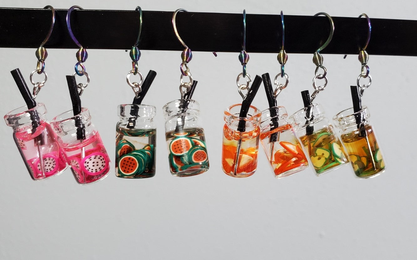 Strawberry Slices Mason Jar Boba Fruit Tea Earrings | Rainbow Dangles |